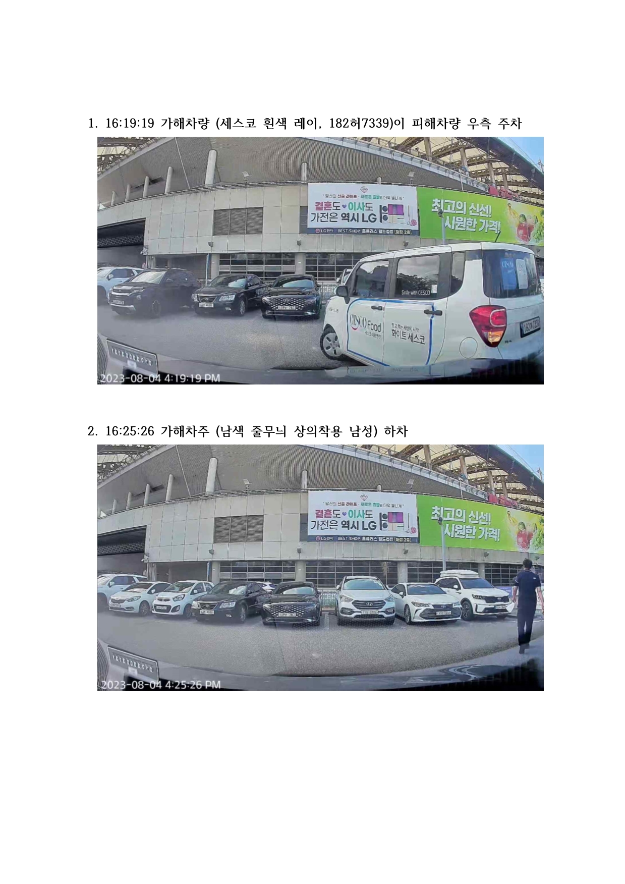 - 8/4 16:19:19 가해차량 (세스코 흰색 레이, 182허7339)이 제 차(남색 EV6) 우측에 주차