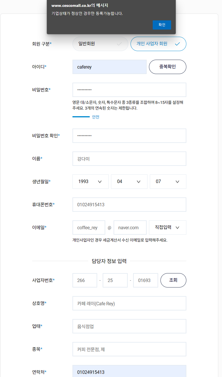 아래와 같이 "기업상태가 정상인 경우만 등록가능합니다." 라는 팝업이 뜨면서 가입이 불가합니다.