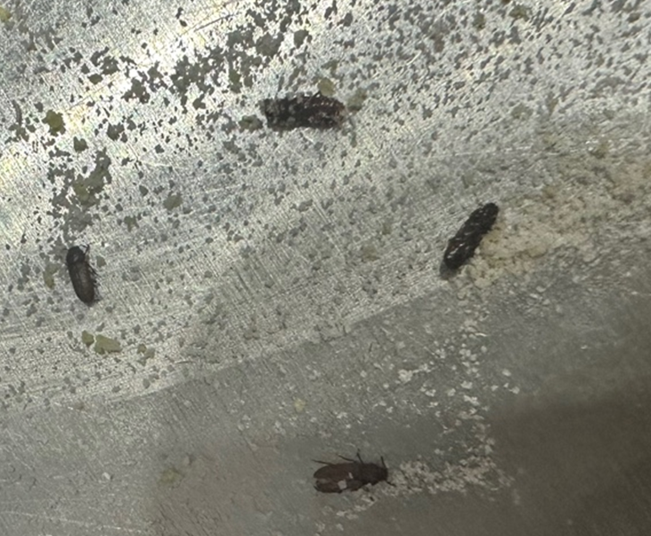 목격 장소를 보아 저장식품해충에 속하는 종류 중 머리대장과, 거저리과의 한곳에 속하는 곤충이 의심되나