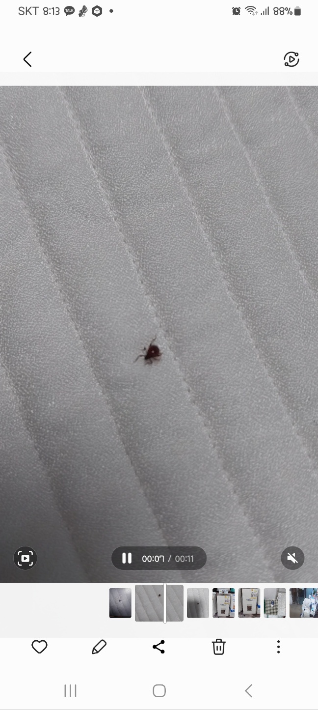 침대 위에서 며칠 전에도 한 마리 보였었는데, 오늘 또 보입니다. 크기는 3미리 정도 되는 것 같습니다.