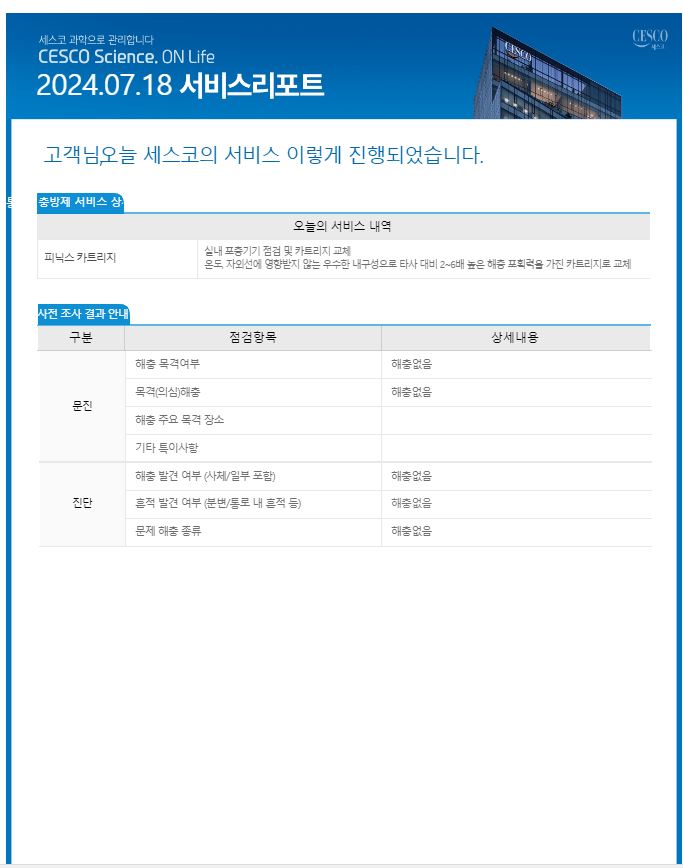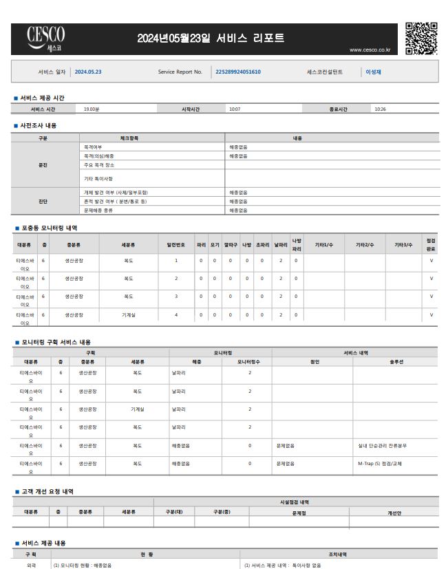 바이오 GMP시설에서 세스코를 이용중입니다. 지난달 까지만해도 서비스 리포트에 어느구역에 몇마리가 잡혔는지