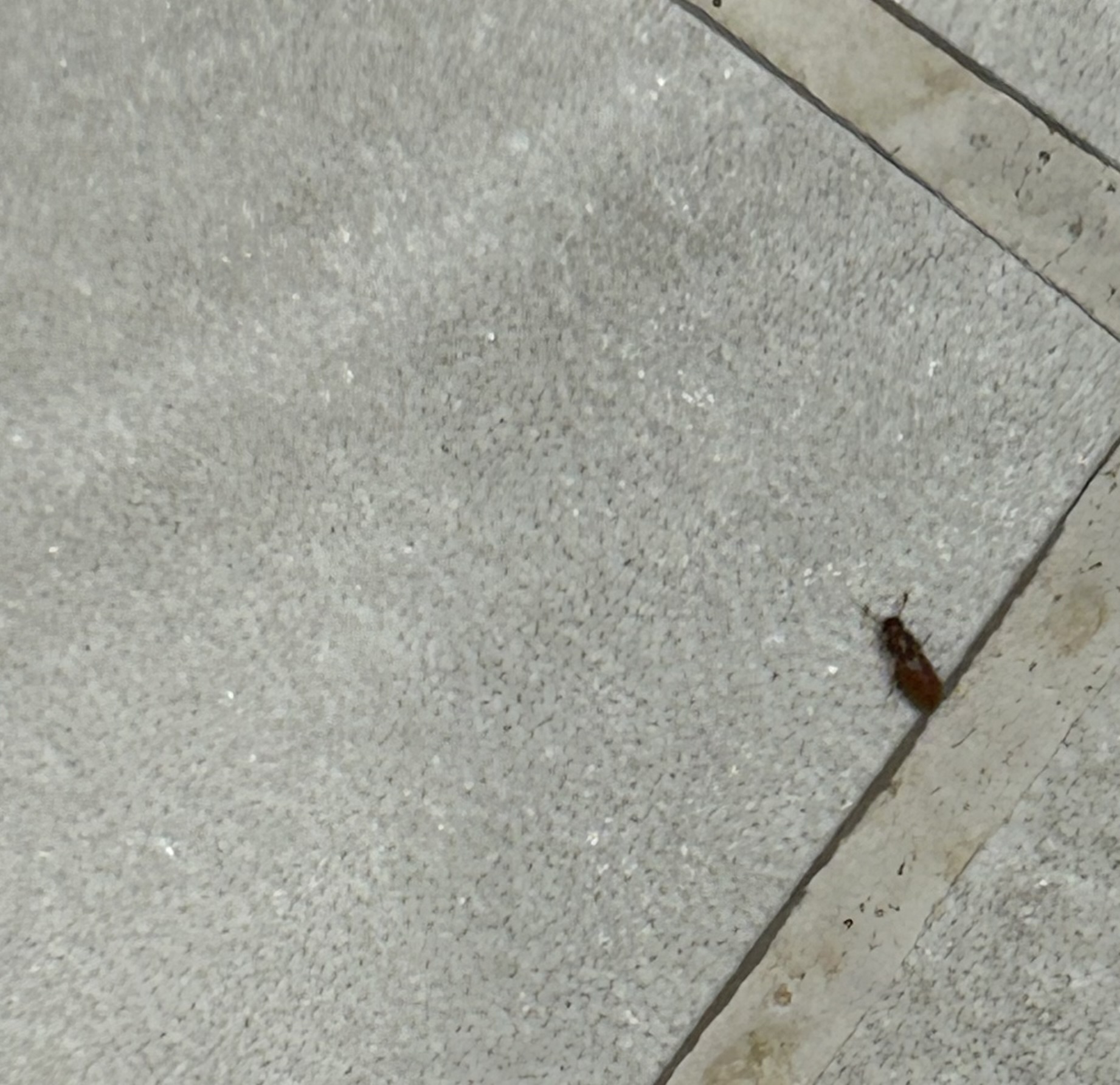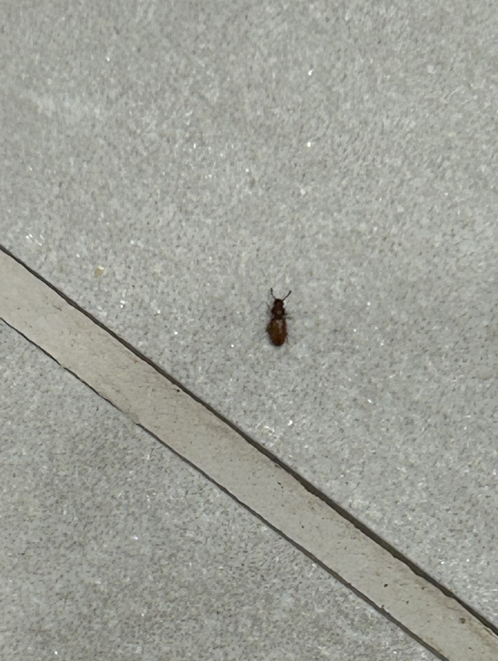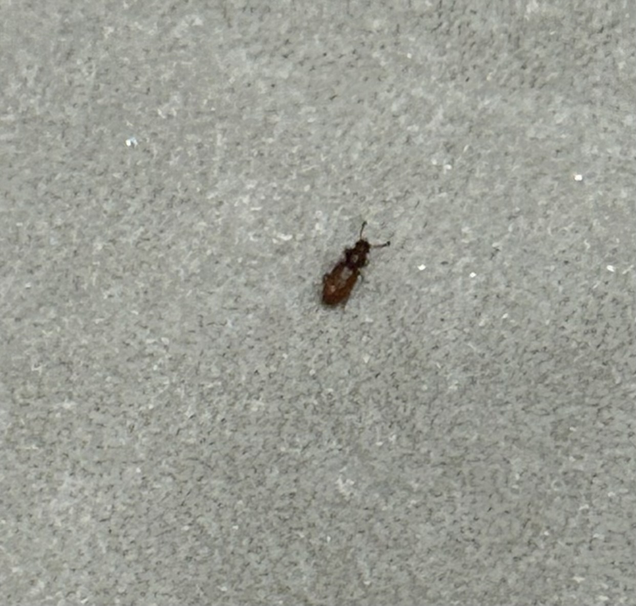사진만으로 명확한 판단은 어려우나 저장식품 해충에 속하는 톱가슴머리대장 종류로 추정됩니다.