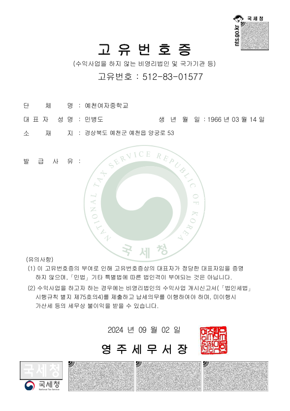 안녕하세요 예천여자중학교 행정실입니다.