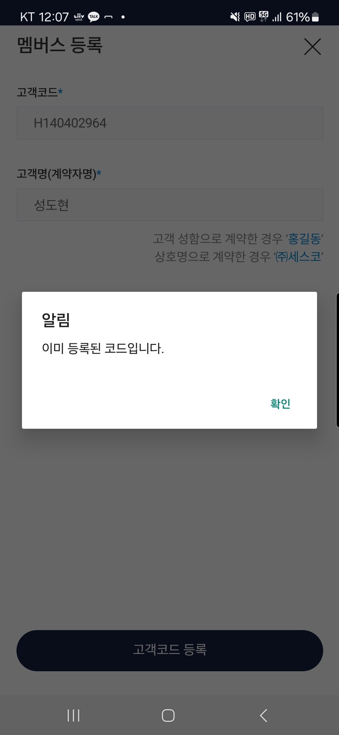 고객코드, 고객명을 제대로 입력했는데 알림에 이미 등록된 코드로 뜹니다.