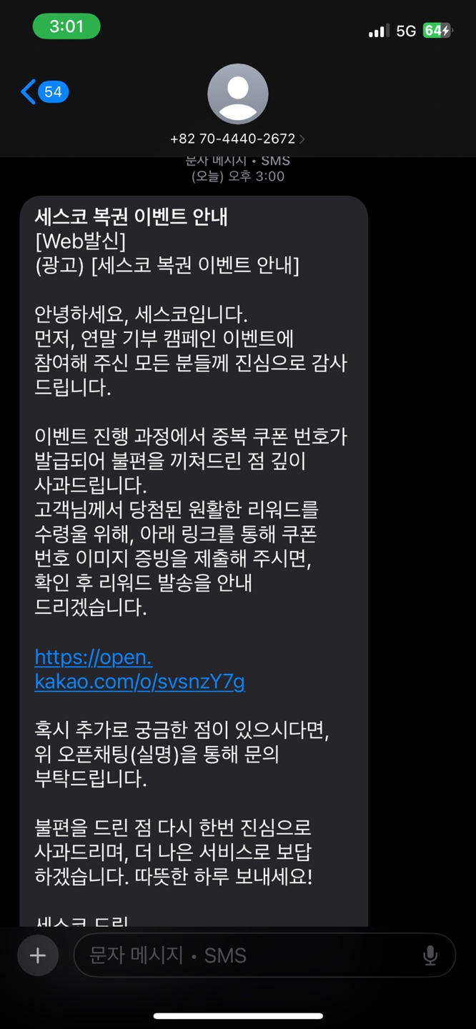 문자로 이벤트 오류에 대한 안내를 받았습니다.