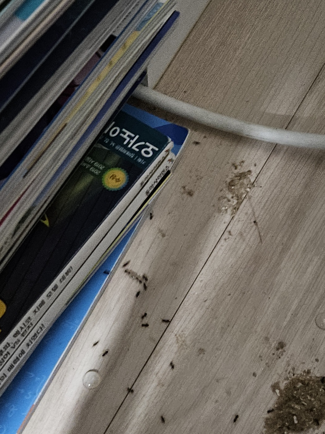 오른쪽 끝에 스탠드 에어컨이 있는데, 2~3주 전부터 목수개미로 추정되는 개미가 에어컨 왼쪽 모퉁이를 왔다갔다 하는 경로로 계속 톱밥이나 모래 같은 걸 가져와요. 처음엔 모래인줄 알았는데, 책꽃이 톱밥 같습니다.
