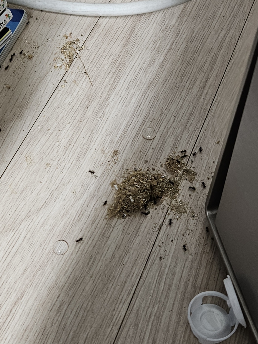 먹이통 설치한뒤로는 더 이상 개미를 잡지는 않고 살펴보고 있는데, 더 기다려볼지, 짓고 있는 톱밥집 제거하고 붙박이 책꽃이에서 나오는 곳에 맥스포스겔을 뿌려둘까 싶기도하고요.