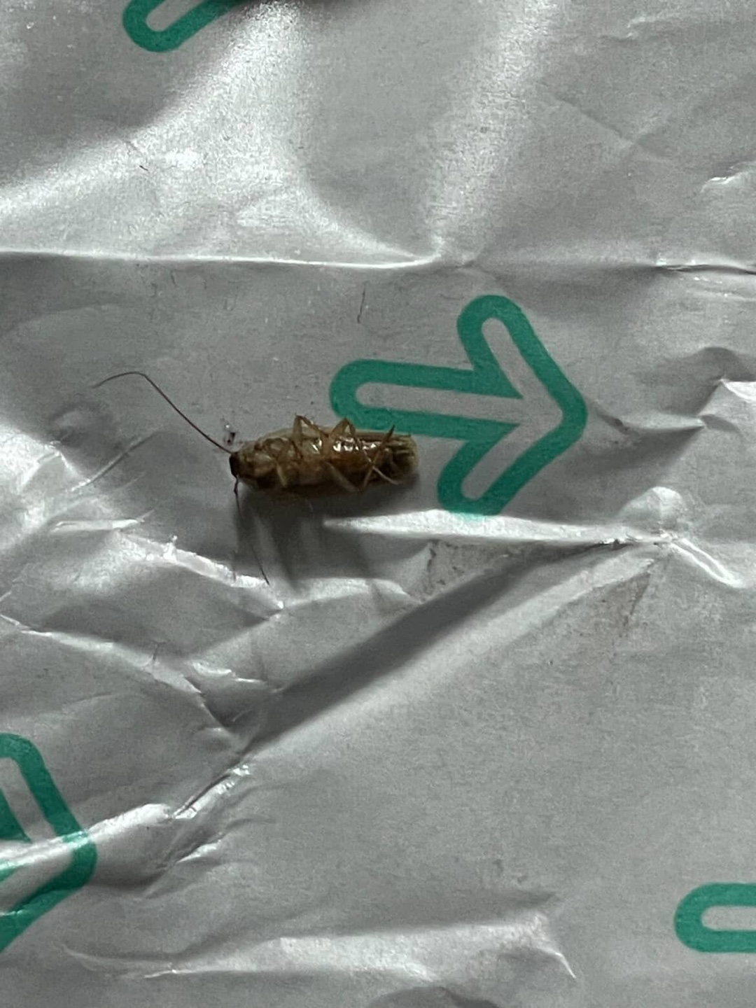 뒤집힌 모양으로 해충을 특정하기 어려우나 바퀴로 추정됩니다.