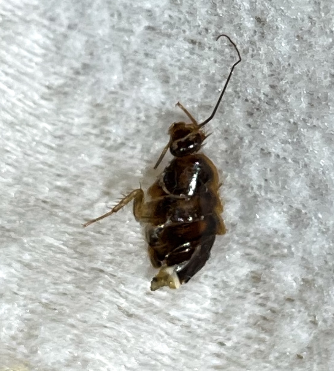 싱크대 밑쪽 하부장에서 밤에 나왔는데 크기는 2cm 정도 되는듯 합니다. 휴지로 눌러서 잡았는데 뽁뽁이? 터지는 소리도 나더군요.. 머리 모양은 바퀴 같진 않은데 이게 제가 휴지로 눌러서 단순히 저렇게 변형된건지.. 인터넷 찾아봐도 비슷한걸 못찾겠네요