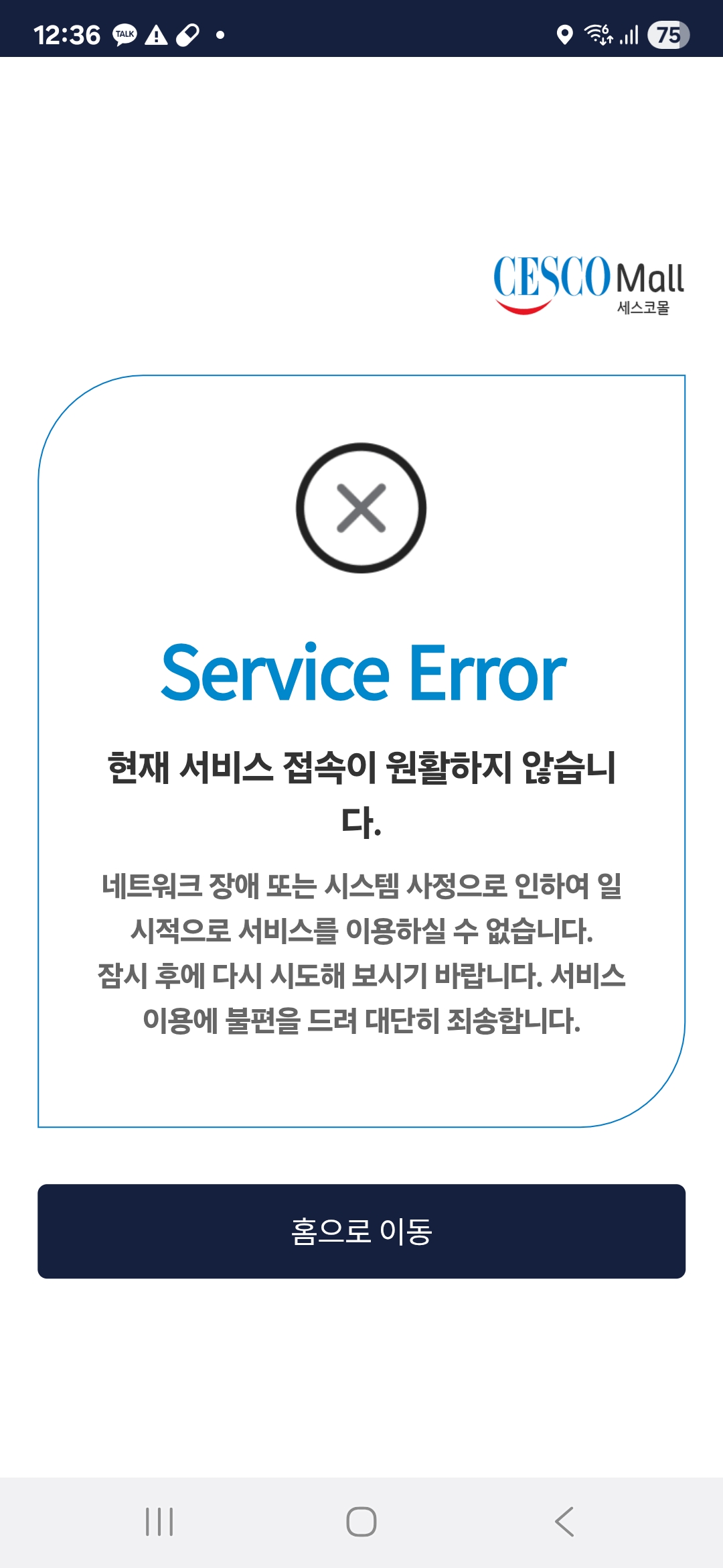 핸드폰 설정 메뉴에서 인터넷 사용 기록 삭제, 쿠키 삭제 후 재로그인 부탁드립니다.