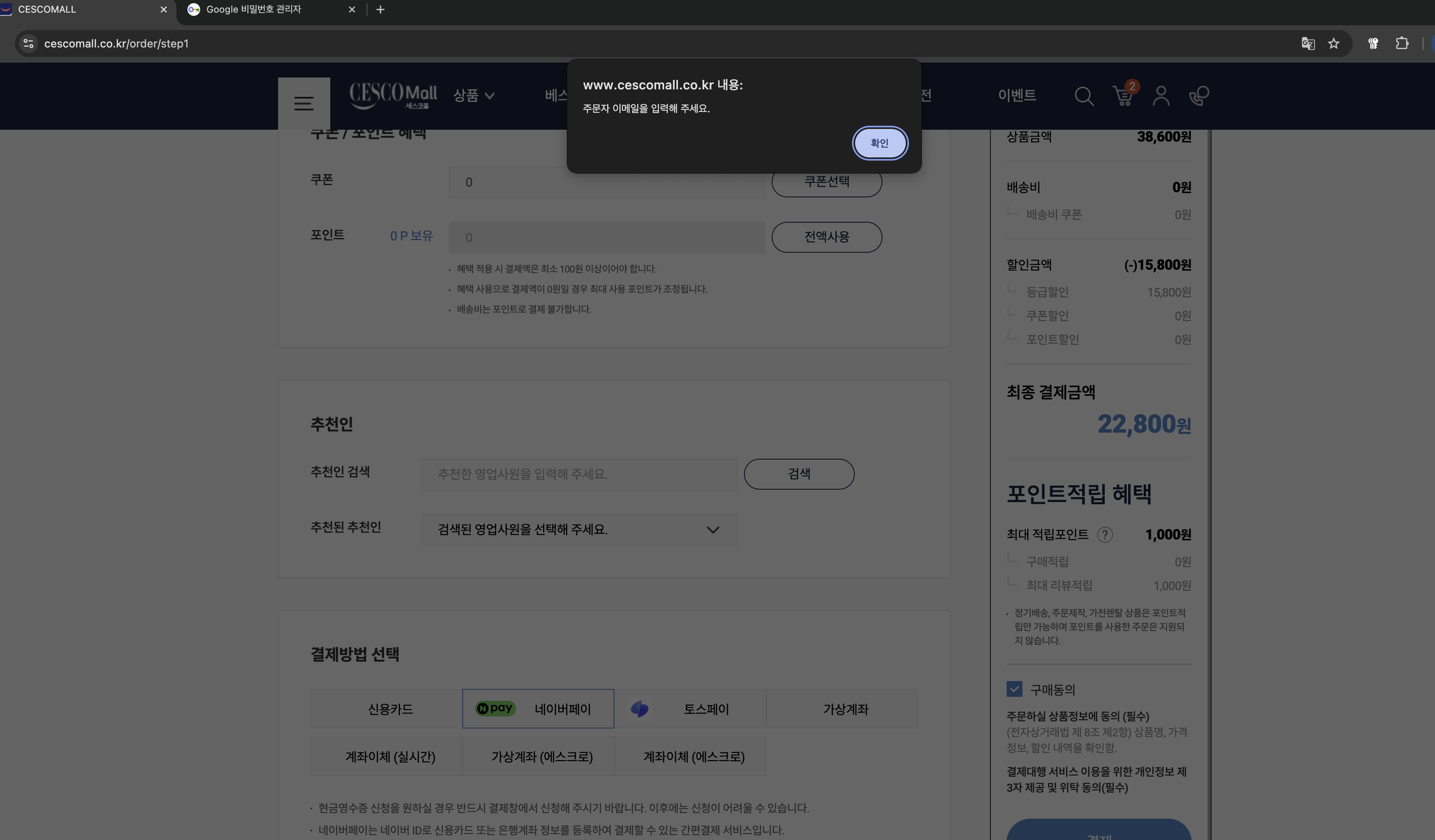 구매시 이메일 주소를 기입하라고 경고가 뜨면서 구매가 되지 않으며