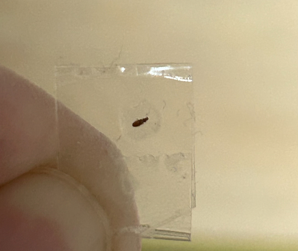 사진으로 명확하지 않으나 저장식품해충에 속하는 종류 중 머리대장과, 거저리과의 한 곳에 속하는 곤충으로 추정됩니다.