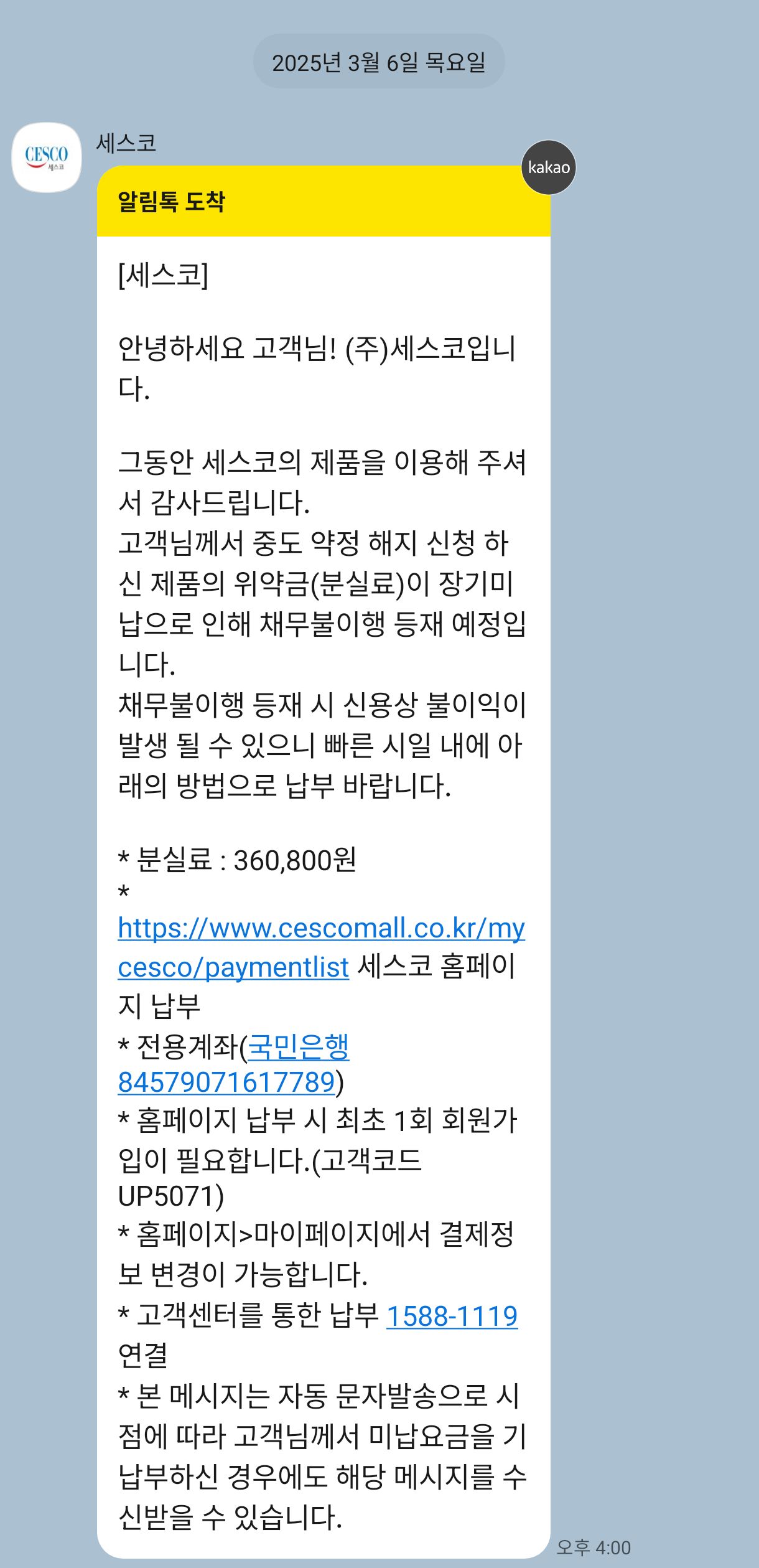 고객님 장기 미납으로 인한 해지와 위약금 발생에 대해 안내드립니다.
