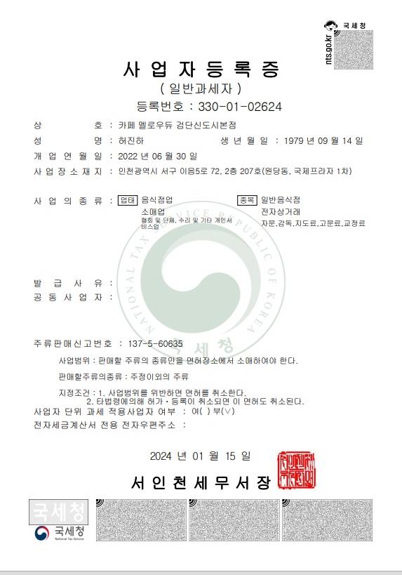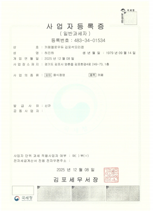 새로운 사업자 카페 멜로우듀 김포석모리점 사업자 번호 483-34-01534 입니다.